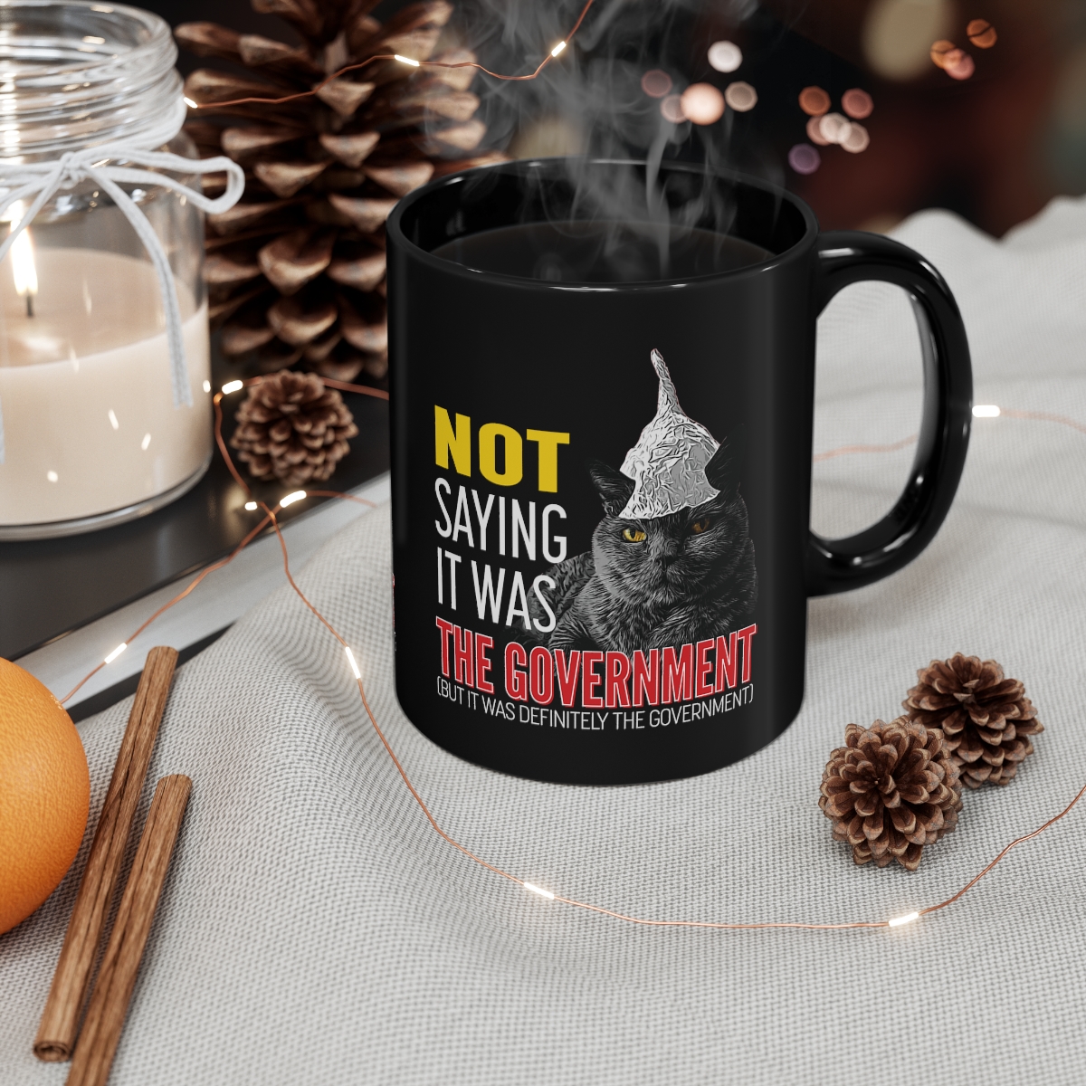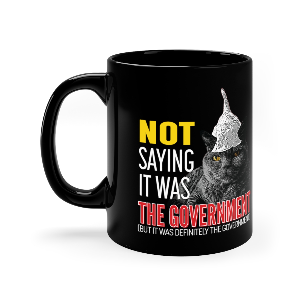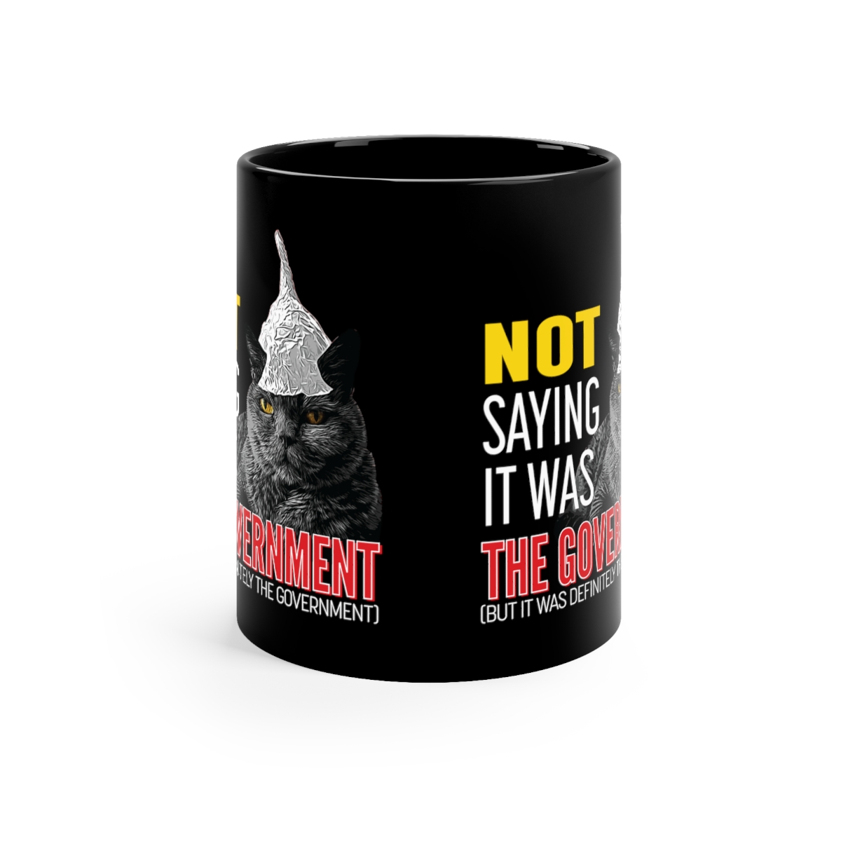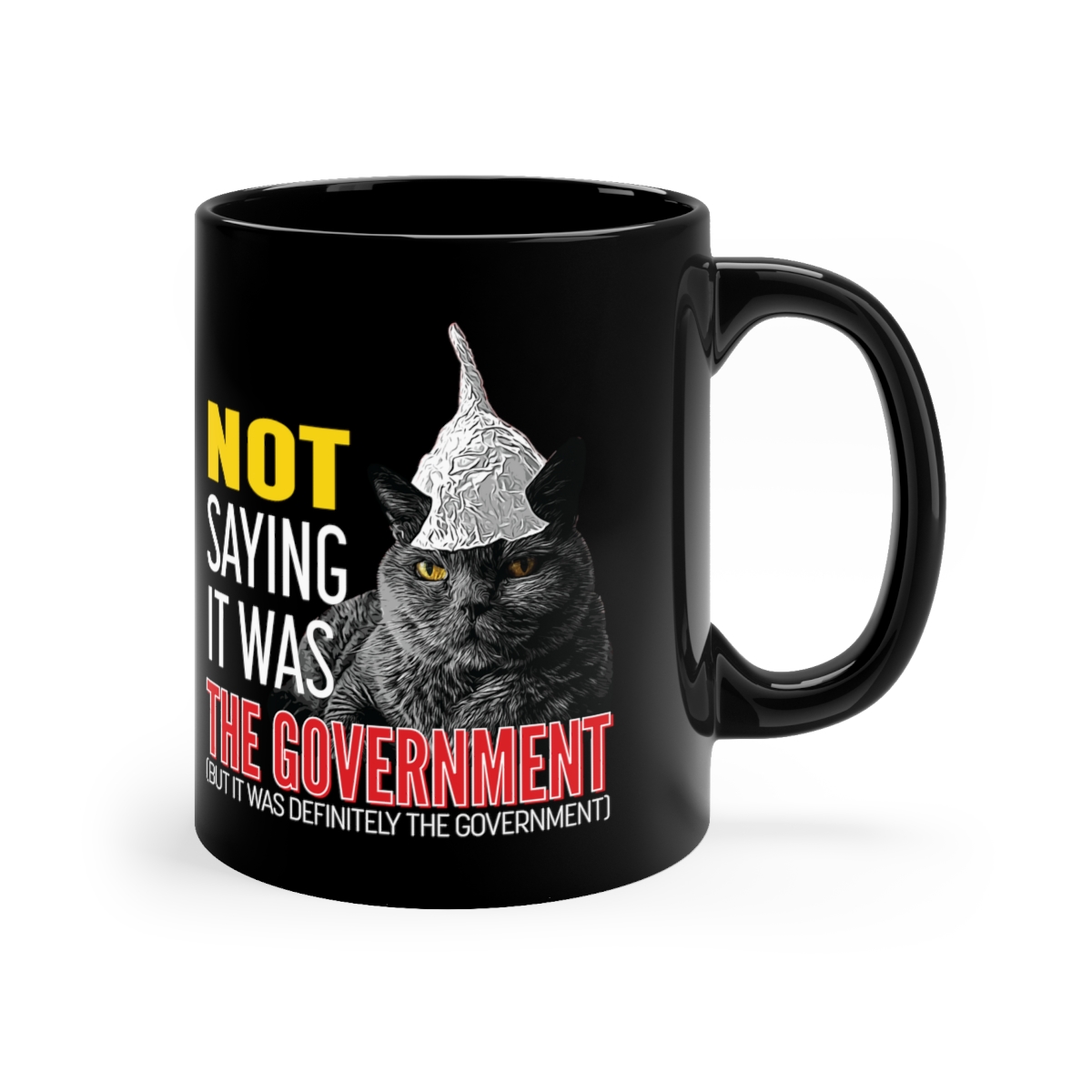Warm your soul with a nice cuppa out of this perfectly sized black ceramic mug. Customized with a cool tin foil hat wearing cat to make that “aaahhh!” moment even better. It’s microwave and dishwasher safe and made of black, durable ceramic in 11-ounce sizes. This high-quality black ceramic mug is the perfect gift for your true coffee, tea, or hot chocolate lover.